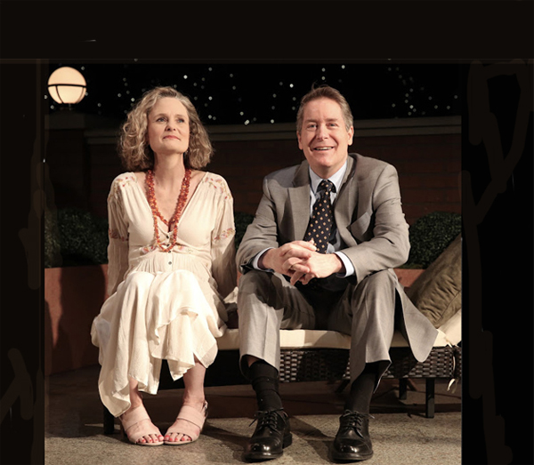 Sally (Jodi Markell), a woman of a certain age, is having a party in her luxe apartment overlooking Boston Harbor. We spend our time – who wouldn’t? – on a large, leveled, topiary-planted terrace under the stars. (Bravo Set Designer Steve Kemp and Lighting Designer David Lander.) Boats, water, and, from behind sliding glass doors, a genial gathering gently break silence. (Sound Design Obadiah Eaves.)