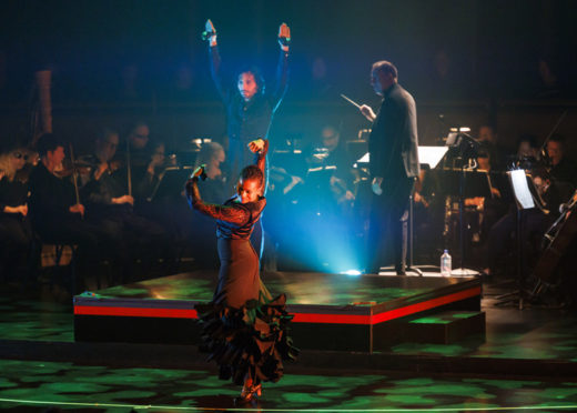 Ginger Costa-Jackson as Carmen and Terrence Chin-Loy as Don Jose, foreground, dancer Camila Cardona and John Brancy as Escamillo on platform