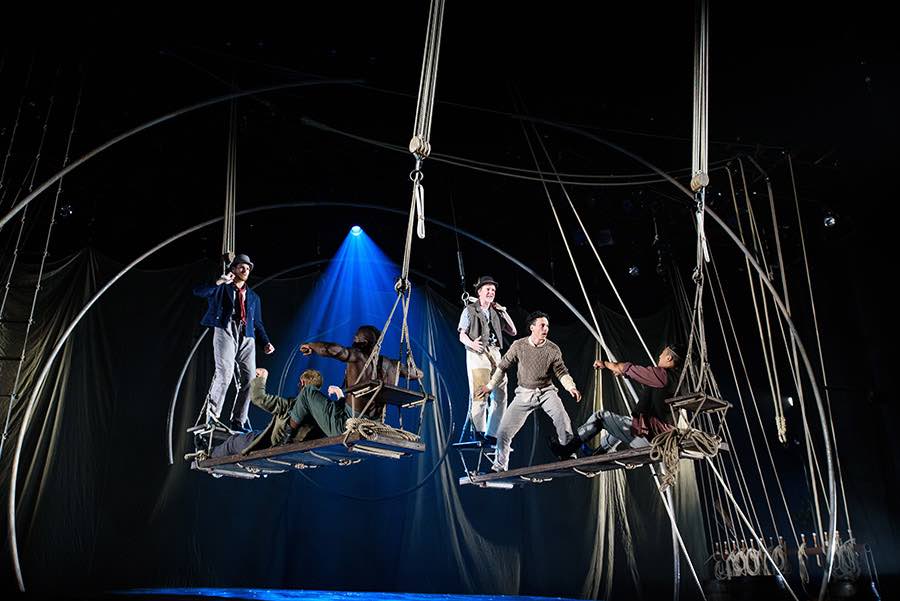 Lookingglass’s production, adapted and directed by David Catlin, debuted in Chicago and comes to Washington, D.C., after a run in Atlanta. Except for a few substitutions, the cast remains intact and obviously has hit its stride. This is an incredibly talented ensemble, delving into their characters, even when required to deliver lines while hanging from the ships’ masts, represented by a circular medal construction that mimics a whale’s ribcage.