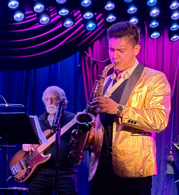 Singer/actor Tim Connell, a 2023 Bistro Award and 2025 MAC Award-winner, brought his ukulele to the stage for the “12 Drunken Daze of Christmas,” another twist on that iconic song and filled with references to various kinds of cocktail concoctions. Connell acted progressively sauced through the song, but musical theater and cabaret star Karen Mason sobered up the audience with a lovely “It’ll Be Christmas Before You Know It,” composed by her husband Paul Rolnick. The first block’s 11-o’clock number at 8-o-clock featured the smooth, swinging, saxophone sound of ALGONZO (Isaac Ketter), who mesmerized on “Saving All My Love For You,” the song which won the late Whitney Houston her first Grammy Award in 1986.