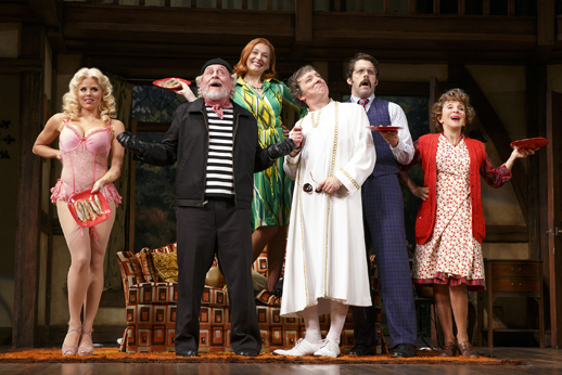 On stage Dotty Otley (Andrea Martin) playing batty housekeeper Mrs. Clackett, is unsuccessfully trying to remember entrances and exits based around two telephone calls, a newspaper and a plate of sardines. “It’s like a slot machine up there,” she says of her mind,” I open my mouth and don’t know what’s going to come out.” Dotty keeps house for employers Flavia and Philip Bent (Belinda played by Jennings Grant and Frederick played by Jeremy Shamos) who are evading taxes in Spain while the house gets sold.