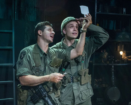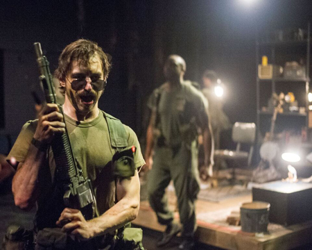 Andrew Cohen has done a superior job with a Set that realizes the chockablock basement as a kind of island, leaving the rest of the theater to immersively serve as Vietnam. We’re first made aware of the jungle above us after a scene at the house. As the semi-circle of chairs are on a slight riser, soldiers’ stomping palpably jars.