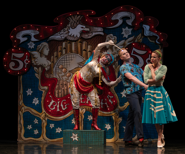 Think Ray Bradbury, The Twilight Zone, now darker. This story-dance is magical and alarming. Big Bertha, a life-sized automaton, is activated by a nickel she noisily masticates and swallows. “When the Saints Go Marching In” plays as it might in a carnival or circus. Bertha climbs off the platform and looks around. She’s stiff, but mobile. A fresh scrubbed, Midwest looking family enters- mom, dad, and pig-tailed daughter in a poodle skirt. Delighted at the curio, they give her a nickel. She briefly moves.