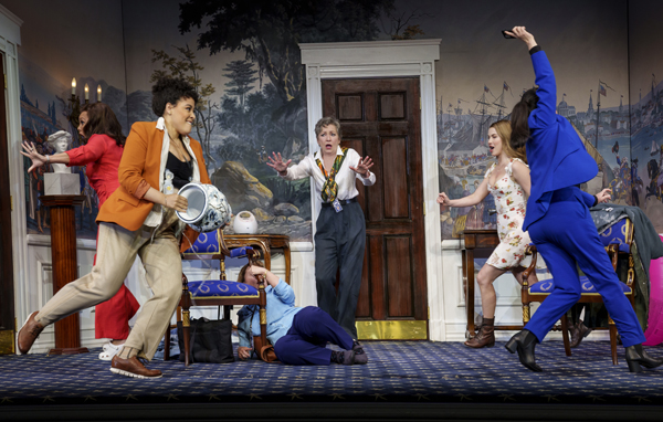 Susan Stroman must’ve had a field day with POTUS. Never before has she had an opportunity to pace and illuminate a non-musical of this nature. The director manages to walk a line between wicked travesty and frustrating reality without losing a beat. Small stage business and sight gags are wonderful, yet never override characters and plot.
