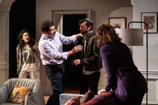 Breaking up the welcome, Marcelle’s Algerian doctor husband, Charles (Jeff Seymour), and son, Daniel (Yair Ben-Dor), enter with blood and commotion. Daniel, a teacher, has been attacked in the unsavory neighborhood where he works. His mother is as angry with him as she is upset and fearful. Why does he insist on wearing a kipa (yamaka), “a target on your back.” At least cover it with a baseball cap!