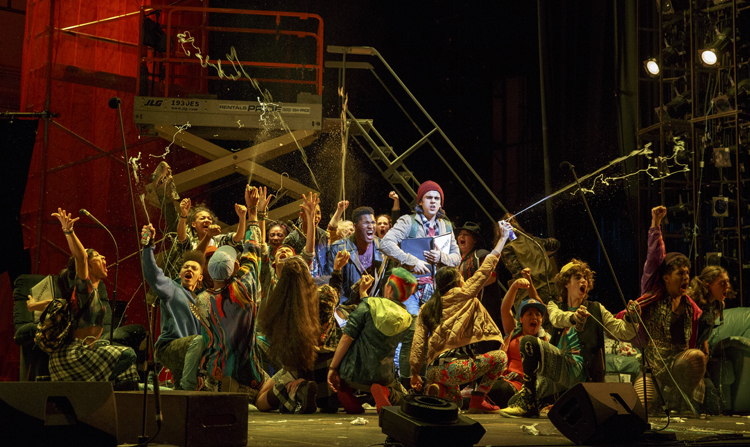 Eeny Meeny Gipsaleeny/Ooh Aah Combaleeny/Ooh, Mamacha cucaracha/COD… From up aisles and out of the wings, 25 young actors between the ages of 12 and 19 commandeer the stage as if they were squatters gathering, not unsuspiciously, for group warmth. Some performers carry books, those who do remain fluent. Most, wisely, look their ages. All but two sing up a storm and everyone moves well. Choreography by Ani Taj is vigorous and cool.