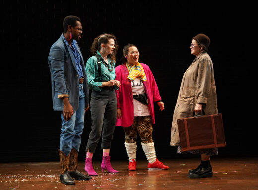 Hand in hand with excellent scenic design (Ricardo Hernandez), moving Mondrian-like panels, lighting design (Alan Edwards), and sound design (Leah Gelpe), collaborative approach here is accomplished. That we’re on team Meryl every step of the way is a testament to a production that might otherwise have drowned its story in tech.