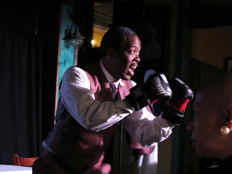 Reginald L. Wilson, apparently about the same size and with similar southern-inflected accent as Sugar Ray Robinson, is outstanding in this role. He bursts in like a firecracker, shifts moods with mercurial skill and never rushes, giving us a sense of real time storytelling. Wilson flirts with heat, laughs with abandon, stills with sincerity and exults in his character’s passion. Bravo.