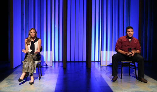 A young couple, here named Man (Frank Harts) and Woman (Elizabeth Masucci) sit at opposite ends of the stage in chairs facing us. (Don’t you hate when a playwright is too lazy to give his characters names as if pretentiously delivering some universal truth?) There’s no fourth wall, both address the audience.
