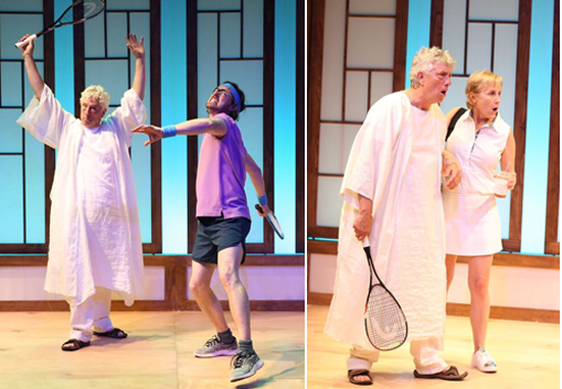 In his robe and sandals, God materializes at The Boca Raton Racquet Club where Fisher can’t find anyone to play. With no visible effort (watch the insouciant gestures), God wins and wins and wins. Unrepentant repartee is extremely frustrating, to Him however. Eventual punishment fits the slight.