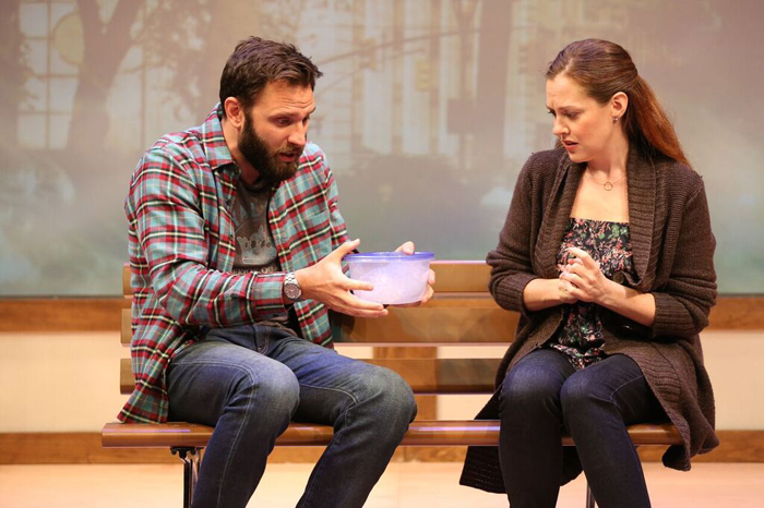 Maggie (Claire Karpen) and George (Quincy Dunn-Baker) meet at a park bench near the dog run, presumably at 80th and Columbus Avenue. (A background image shows The Museum of Natural History.) They’re both upset, George that he tried to reach her all night and couldn’t, Maggie that she hadn’t been reached. (Her phone was off.) There’s been a death.
