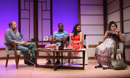 Dana (Rachel Napoleon) and Lonny (Donovan Mitchell) are selfish, material-proud, generation Xers to whom price and labels are paramount. Like many who attribute prime importance to these aspects of life, they’re also extremely cheap. Having just returned from the honeymoon, flush from what they agree was the wedding of the year, the couple invite dear friends Edi (Georgia Ximenes Lifsher) and Alan (Andy Powers) – not a couple- to dinner. Pleasantries are exchanged, but the only thing on anyone’s mind is the recent event.