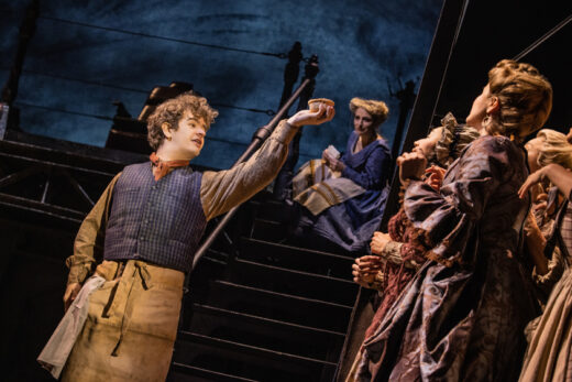 We enter the theater to fog. This time around, in a much, much smaller house, the set by Mimi Lien offers a stone arch, a (well employed) mobile dock tower with dangling, loading hook, a second level catwalk/ balcony and a smear of color on the back scrim. All serve without alas evoking grandeur or oppression. The pie shop’s slide, oven, and meat grinder are creative. Costumes by Emilio Sosa are period accurate, broken-in, more authentic and less theatrical than earlier versions; aesthetically symbiotic onstage.