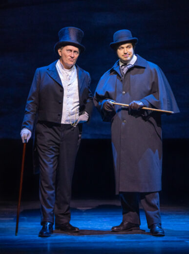 Sweeney announces reentry into the profession with a street contest against snake oil salesman/barber Pirelli (Nicholas Christopher – suitably over the top, but wearing way too much make-up). When the so-called Italian tries to blackmail Barker, he becomes the first victim. (Not enough blood.) Mrs. Lovett then inherits Pirelli’s young hireling Tobias who becomes her barker, waiter, and protector (Gaten Matarazzo- pitch perfect – sweet, devoted and finally believably vengeful). “A Little Priest,” the brilliant who’s-in-what-pie song, is exuberantly funny in the hands of Ashford and Groban whose chemistry is a great asset. (The price of meat being what it is, a human body’s as good as a pussy cat. Get it?)