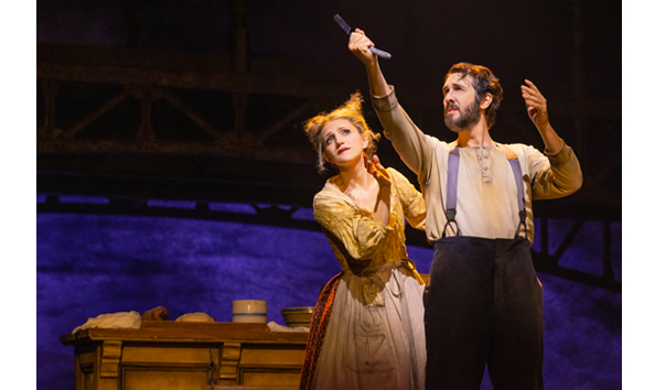 Sweeney (cue loud applause for Josh Groban) and the sailor Anthony (Jordan Fisher whose pop voice and lack of acting chops are disappointing) disembark. They encounter a ubiquitous beggar woman (Ruthie Ann Miles – beautiful vocal, less believable with dialogue). The hero makes his way to a former room on Fleet Street where he meets Mrs. Lovett at her pie shop. (Cue applause for Annaleigh Ashford.) Mrs. Lovett bites off a piece of carrot in her mouth – both chunks falling into a pie – blows dust off the pastry she hands Sweeney, and robustly kills several bugs. Ashford has a way of lowering her voice to emphasize a single line that never fails to land. Her cockney is excellent.