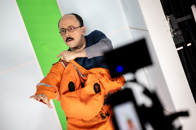 “Is anyone out there? This is Egon Tichy. Does anyone copy, over?” Egon Tichy is making a solitary voyage somewhere near the star, Betelgeuse. STARLOG: MONDAY. “I appear to be outside range. Finally some peace and quiet.” The astronaut (Joshua William Gelb) stands in a narrow, recessed doorway bookended by panels to storage and passages elsewhere. A vertical window looks out between two horizontal video screens.