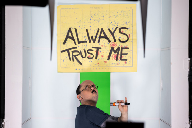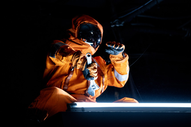 We hear echoed heavy breathing (Original Music and Sound Design – M. Florian Staab) and see a tiny Egon at the edge of ship blueprints. Stylized visuals depict space. Scenic Designer Peiyi Wong’s schematics show us where the protagonist is throughout. Combination of flat art and video