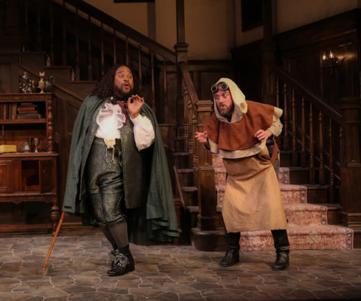 Sir Epicure Mannon (Jacob Ming-Trent – who seems to be infectiously having as much fun as we are) wants a philosophers stone that changes base metal into gold. The “fop” is accompanied by faithful servant, Surly, who hails from the Dutch Colony, Brooklyn. (Louis Mustillo – a Damon Runyan character with pitch perfect accent.) Surly is skeptical of goings on and futilely tries to stop them. The delivery of every metal object Mannon owns is a hoot. Subtle has donned a black coat and Elizabethan collar. To turn metal into gold apparently requires a small amount of gold. Fortunately, “an itinerant gold peddler” passes. Unfortunately there’s an explosion in the basement. Fortunately a second stone is “cooking.”