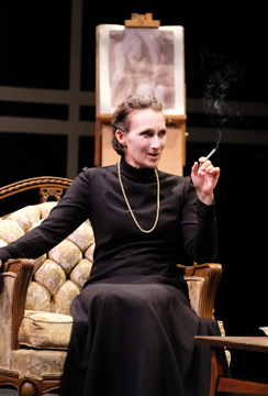 One of the ugliest, most inappropriate Sets I’ve ever seen (Aleksi Ranta) affects everything on stage. Tightly tufted period furniture stands adrift in front of black, white and a single yellow rectangle emulating Mondrian-like patterned walls. Furniture and background are at war. As if this weren’t enough, in the course of the play, a white pillar is stripped to reveal red – indicating passion? – and a blue rectangle is exposed. If there’s meaning here, it’s completely obscure. (Blixen dressed as Pierrot without explanation must fit in to this puzzle somehow.)