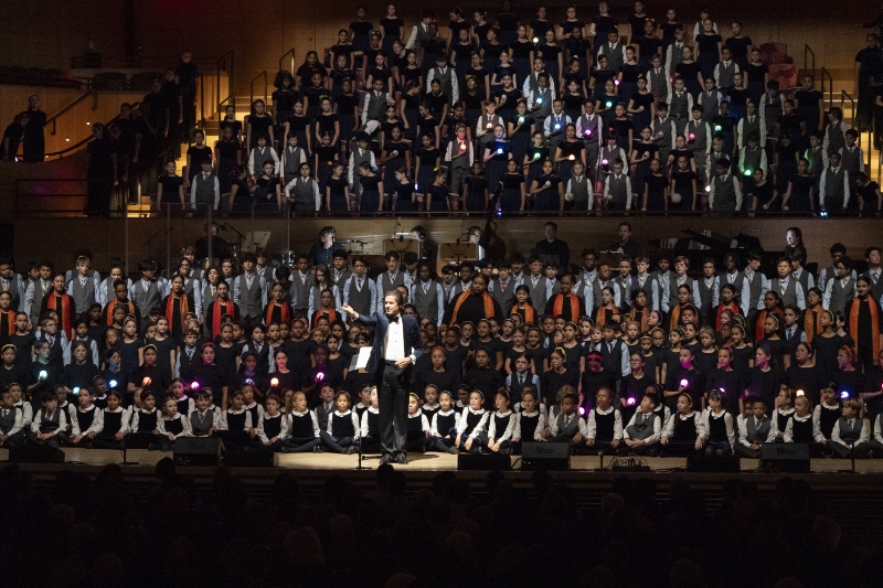 Francisco (center in the photo above), who founded the Children’s Aid Society Chorus in 1988, becoming the Young People’s Chorus of New York City in 1997, won a MacArthur Fellowship in 2011 for “shaping the future of choral singing for children.” He has continued to take the group to new heights, working with famous musicians and composers like Tandon to expand the group’s repertoire. In addition to performing at high profile events in New York City like the Macy’s Thanksgiving Day Parade, the Tree Lighting at Rockefeller Center, and the Christmas Concert at St. Patrick’s Cathedral, the group has traveled internationally, winning awards along the way.