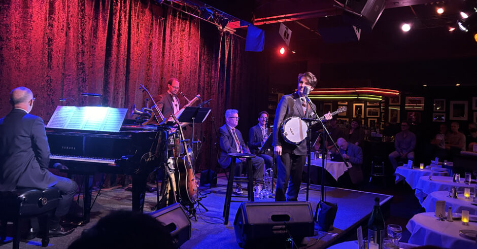 Edwards dresses for the role, spikes stage patter with “gee” or “gosh,” and injects apt exclamations into songs. Scat is uniquely, fluently from another era. Eyebrows raised, book-ended by a “diddly- dow-dow and an aw-oh-wah,” the artist plays George and Ira Gershwin’s “Fascinating Rhythm” on a tiny ukulele. The tune just turned 100.