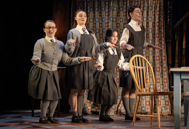 It’s 1955. Four siblings in school uniforms gather in the kitchen for tea: Young Jill (Nicola Turner), Young Ruby (Sophia Ally), Young Gloria (Nancy Allsop), and Young Joan (Lara McDonnell). Mom Veronica, a war widow, is testing and leading them in a group channeling The Andrews Sisters all of whom they can quote. The singing group, she points out, also had no advantages and look what happened with them! All the young actresses are unselfconscious, top notch.