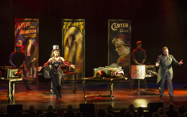 Rick Thomas (The Immortal), who declares himself “not bound by the laws of nature”, presents the chestnut illusion of open boxes in which objects and people disappear. With little personal spin, this is less effective than it might be. He’s more fun with the classic fluency of endless doves emerging from handkerchiefs (and thin air) and hosts Act II’s “The Parlor” with brio. This segment employs volunteers gathered at intermission who are called upon to participate in short bits. Hapless human guinea pigs are humorously handled. Say that five times fast.