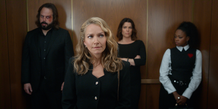 (L to R) Angus Sampson as Denis ‘Cisco” Wojciechowski, Becki Newton as Lorna Crane, Neve Campbell as Maggie, Jazz Raycole as Izzy Letts (Photo Cr. Courtesy of Netflix © 2026)