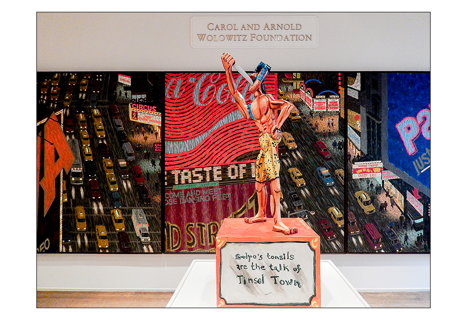 Opening photo: Yvonne Jacquette’s “Times Square Triptych II” and a Red Grooms sculpture share a gallery and present a vision of New York