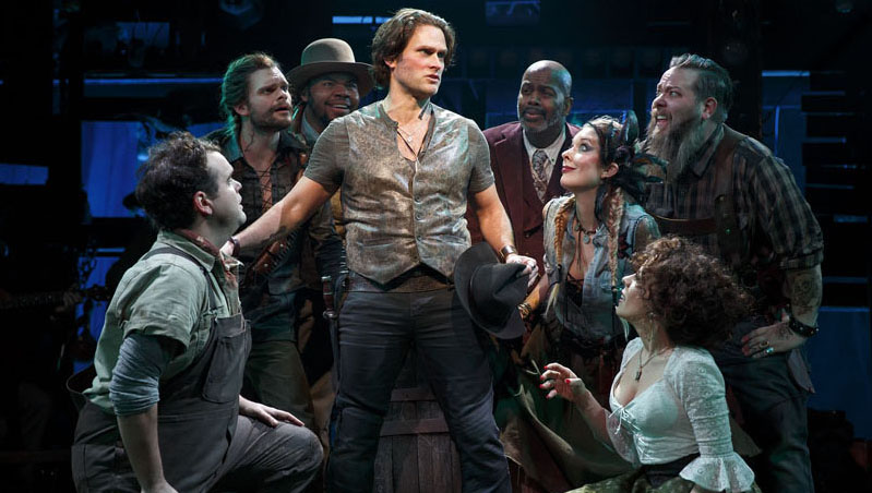 Upright citizen Jamie Lockhart, (heartthrob Steven Pasquale of Bloody Bloody Andrew Jackson and The Bridges of Madison County) comes across Little Harp (Andrew Durand, a pitch perfect scalawag) robbing rich plantation owner Clement Musgrove (a genial Lance Roberts) under the watchful direction of his brother, Big Harp (Evan Harrington), whose live severed head he carts around in a trunk. Got all that? Two heads are better than one… When Jamie sends Little Harp packing, the victim tries to give him gold, but is refused despite Musgrove’s assurance there’s a lot more where that came from.