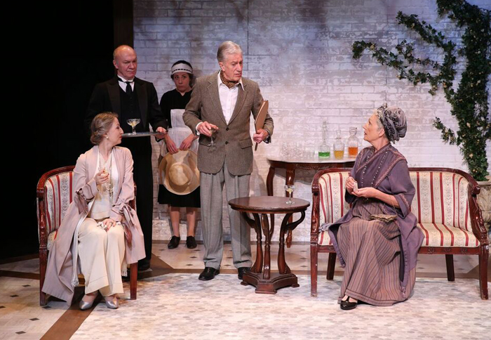 Ostensibly a lightweight drawing room satire about changing social order, the play evolves over a Saturday afternoon in the life of failing businessman, (Lord) Richard Kettlewell (Brian Protheroe). The reserved patrician has a single guest at his country manse, old friend, Churton Saunders, aka “Chuffy” (Hugh Sachs), a self avowed Edwardian who gets all the good lines. Expecting only his young associate Farrington Gurney (Charlie Field), the host is informed by butler Parsons (Derek Hutchinson) of imminent arrivals by Lady Knightsbridge (Richenda Carey), a mercenary, all purpose “fixer,” and territorial mistress Hilda Lancicourt (Carol Starks). Kettlewell is long separated, but still married.