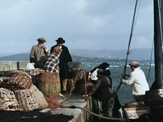 The daughter of another denizen just sent three pounds from America. “If a poor man like me has three daughters that send money every week…In America, I could be livin’ decently and earn my bread…” Locals are torn between promise and commitment. We see basket making, boats with homemade patchwork sails. “…better to have everyone stay behind to build roads and piers.” Synge and Yeats travel across river in a flat ferry with livestock.