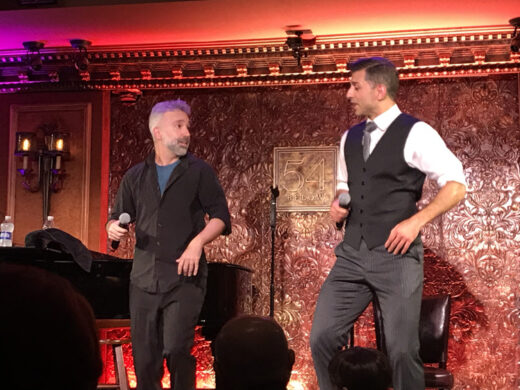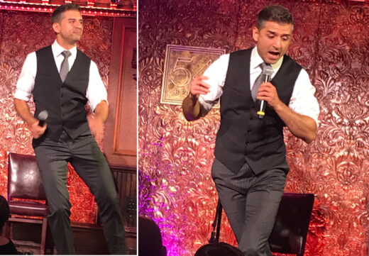 “All I Need is The Girl” (Jule Styne/Stephen Sondheim – Gypsy) begins with steps every few lyrics. Breakout tap shakes the stage like thunder. Yazbeck comes down hard and clean. Solely embodying neither Astaire’s grace nor Kelly’s athleticism, style is closer to the dancer later declared his hero, Gregory Hines. It’s declarative, more is more choreography deftly utilizes the whole body. The stage has been cleared for movement and move he does, covering every bit of space! Even “taking a break,” feet work double time. “Now, all I need is the girl!” Yazbeck sings. “I’m here!” shouts a woman from the audience. He visits the table.