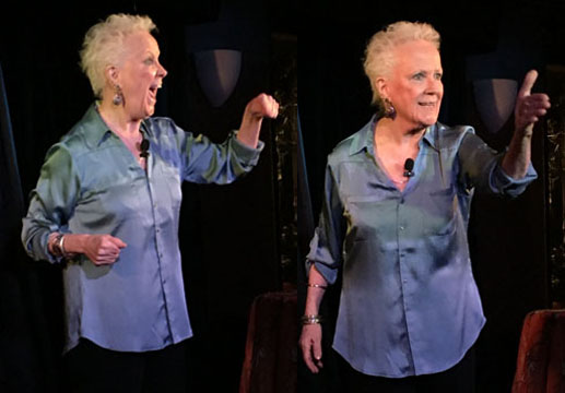 Were this a silent film, mercurial emotions would come across clearly. McCall has a face of infinite facets and arms that extend images/thoughts too demanding to remain hidden. The responsive audience eggs her on, laughing at themselves. “Let’s have a show of hands-how many of you know you’re going to die? Ah-to some of you, it will be a surprise. Now, how many of you believe it?… That’s bullshit.” Too true.