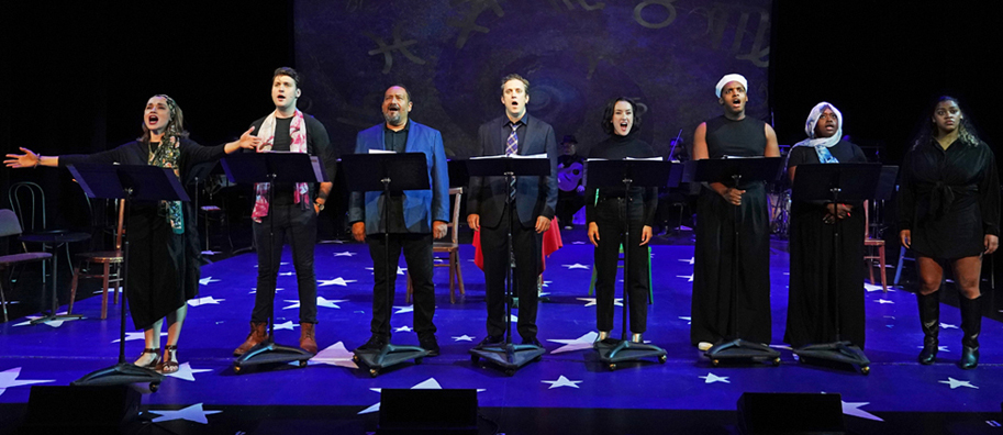 Despite evocative music (just eerie enough) the opening number is weak, dissipated by breaking up line by line what should be one narrative voice. The show’s title song could be much improved. “Nothing can happen/Then something just happens” is awkward. Several others, predominantly involving the company, run on and on and on. Vocal arrangements are captivating (throughout), lyrics often very good, but fatigue threshold is challenged. I don’t mean to damn music and lyrics, much of which are excellent, just to suggest edits. Twist of Fate has strong potential.