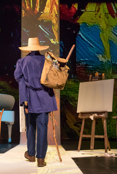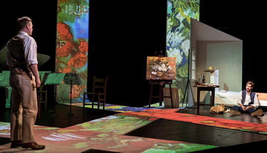 Picture a black and white Set with the picture frame over a fireplace (home to Theo van Gogh), an empty canvas on an easel (Vincent van Gogh’s messy, minimal dwelling), and white panels from floor to ceiling extending diagonally across the stage floor. Add a white piano and chairs for musicians. (The rest is black.) Now imagine the walls, panels and floor as much blank canvases as those which are obvious. On these, visualize projections of van Gogh’s artwork so detailed we see paint texture, so large you may not be able to identify even familiar paintings.