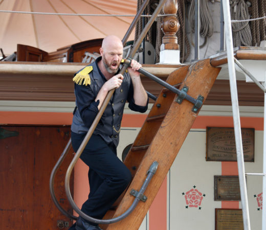 What Lies Beneath is a site-specific performance of five arias, several with potent spoken word, immersing audience in the maritime connection to America’s unconscionable slave trade, and one aria of Captain Ahab’s final moments of reckoning (Melville’s – Moby Dick) representing moral comeuppance. Though the Wavertree was a cargo ship, its atmosphere is much like those vessels that kidnapped Africans who were then sold into slavery. From vignette to vignette, those attending are moved (after a bosun’s whistle) to a new location on deck by quiet, efficient ushers. Geography is well employed to feature vocalists on several levels. Dramatization is entirely fluid.