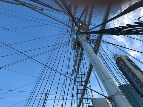 It’s Monday evening. I find myself again on the deck of the Wavertree tall sailing ship at South Street Seaport. (I wrote an article about the ship in June.) There is, thank you, a slight breeze. Tonight’s audience sits I n well-spaced, wood folding chairs beneath the open sky and a web of rigging.