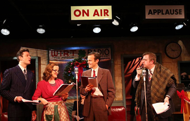NOW it feels like the holiday season. Escape today’s uber-fraught world for 70 glorious minutes at Irish Repertory’s intimate W. Scott McLucas Studio Theatre. Attend a live 1946 broadcast based on Frank Capra’s iconic film It’s a Wonderful Life. Watch actors dressed in pitch perfect period street clothes (by Barbara Bell) gather at station W I R T, The Hearin’ O’ The Green, (mostly unused) scripts in hand, each morphing into multiple characters with speed, specificity, and charm.