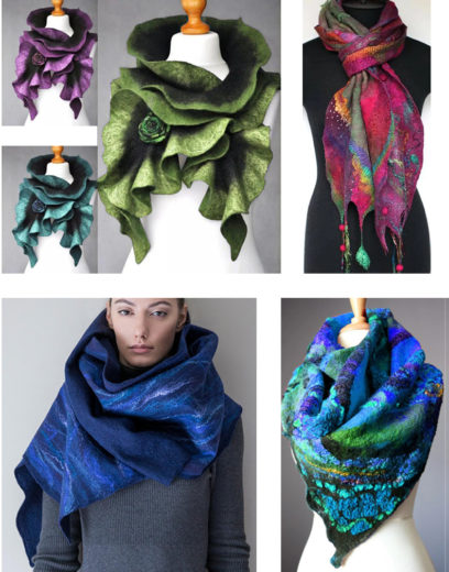 Merino Wool “Deep Sea” Felted Scarf: Handmade. Decorated with silk and natural viscose threads. 69” $163.62
