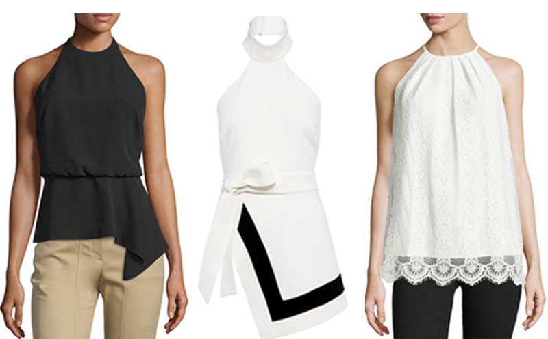 Left: Halston Heritage Halter-Neck Strappy-Back Top- Dress up or down. Wear stark with white pants or pump up the volume in color. Polyester/spandex. Blouson bodice; flattering peplum waist. Asymmetric hem. $275.00