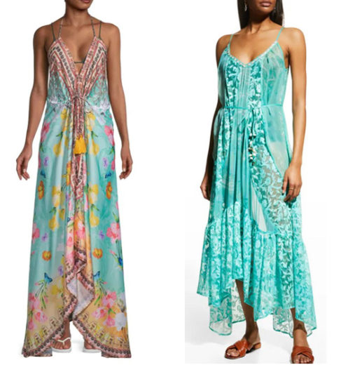 Right: Caylin Printed Maxi Coverup Dress by Ramy Brook: V neckline Adjustable straps Self-tie waist A-line silhouette Handkerchief hem Slipover style Semi-sheer polyester $295.00