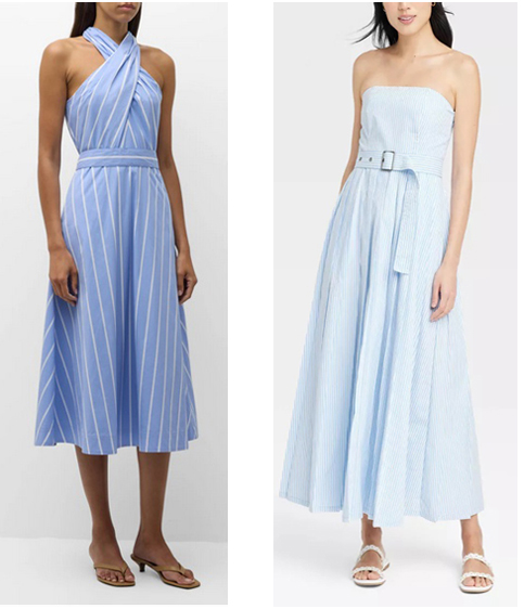Left: Baylee Stripe Halter Midi Dress by Veronica Beard:Featuring a crisscross halter neckline Defined waist A-line silhouette Hem falls below the knee Invisible back zip Cotton/nylon/polyamide/elastane Lining: Cotton $498.00