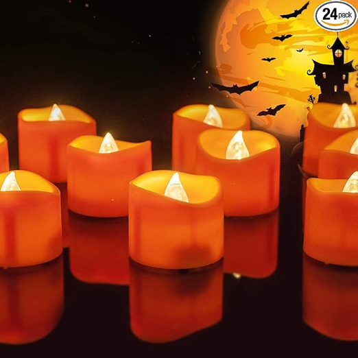 Orange Tea Light Candles. Light up your hoe with 24 orange tea light candles that are battery operated. Safe around all those little gremlins.
