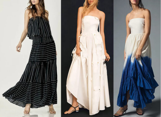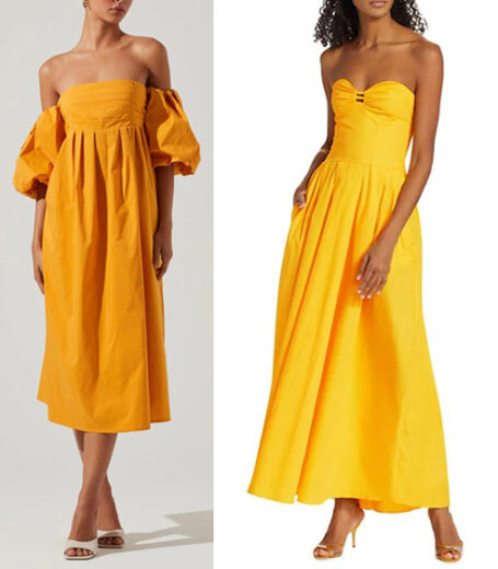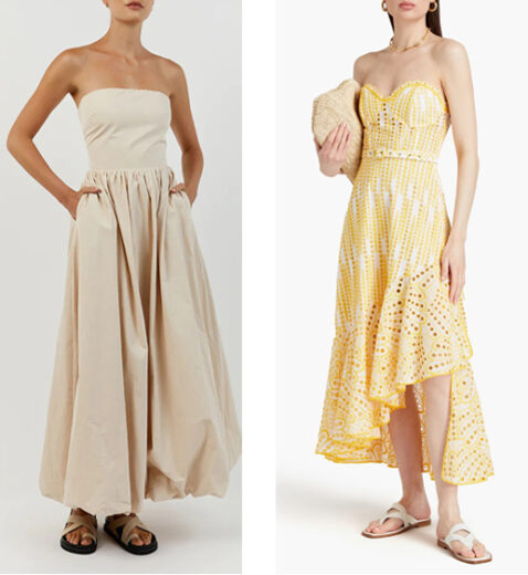 Left: 100% Linen (Machine washable) Cutout Strapless Minimal Midi Dress: Also black. Crisscross and cutout detail at the bust with smocking in the back. Body-skimming fit. Falls 50″ from high point of shoulder Sale $134.