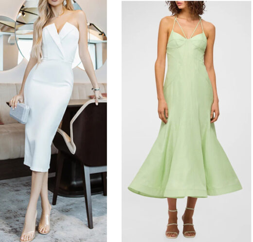 Left: White V-neck Cocktail Midi Dress: Polyester crepe / elastane Strapless Corseted top Bodycon fit Back slit Hidden zipper Sale $99.50