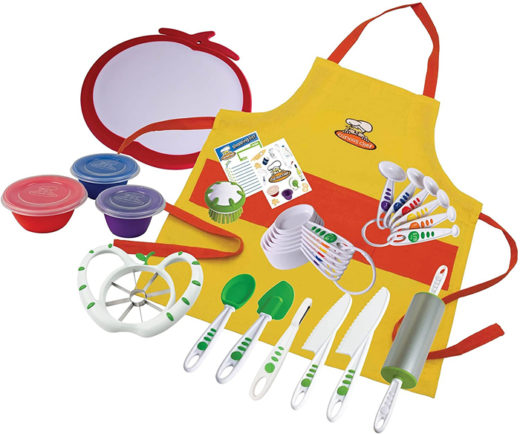 Children’s 25-Piece Kitchen Basics Kit by Curious Kids: Includes small & medium nylon plastic knife, apple slicer featuring oversized handles, vegetable scrubber, blade-guarded fruit and vegetable peeler; a color-coded set of 6 measuring spoons and 6 measuring cups, medium silicone mixing spatula and silicone mixing spoon, non-stick rolling pin, three prep bowls with lids, and an adjustable, washable cotton child chef apron. Silicone tools are heat safe up to 450°F. Dishwasher safe and BPA free. Ergonomic handles featuring soft-touch button grips are designed for children’s hands for easy holding. $59.99