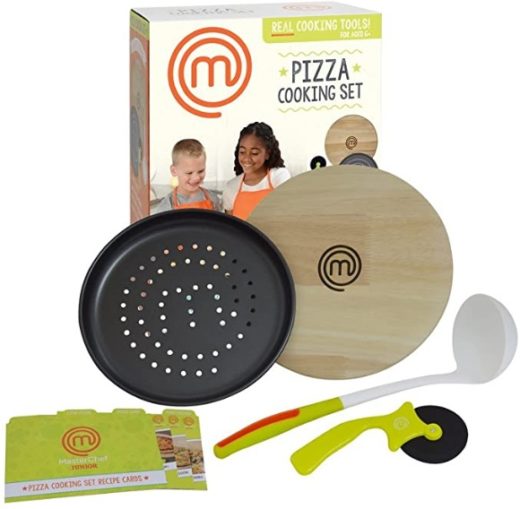 Junior Pizza Cooking Set by Masterchef – 5 Pc Kit Includes a sauce ladle, wood pizza board, personal pizza pan, a plastic pizza cutter, and 3 unique pizza recipe cards for all levels of experience, plus 1 blank recipe card to write his/her own recipe! Kid-safe, non-slip silicone grips. Ages 6 and up. $28.99