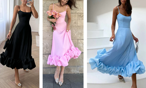 Opening: Flounce Bustier Midi Dress: 7 colors Flounce Bustier corset with bones and cups Ruched and puffed hem Hidden zipper. Lined. $530.00
