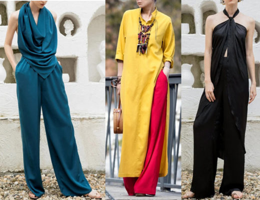 Crepe de Chine Two Piece Set: Bespoke. 16 color choices. Halter cowl neck with button closure Sleeveless Open back with tie Long wide-leg pants with front elastic waist, and side pockets. $135.00